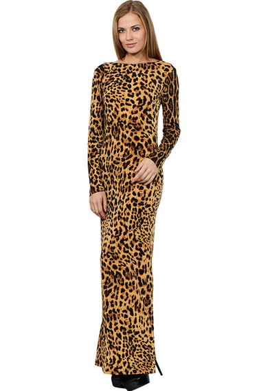 Изящное длинное платье с классическим леопардовым рисунком.  Впереди данная модель полностью закрытая, с длинными рукавами и вырезом лодочкой, а сзади большой вырез, открывающий спину. Вырез декорирован золотистыми цепочками, придающими особый шик этому платью!