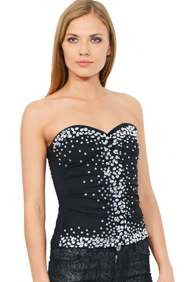 Нарядный топ-бандо расшит блестящими камушками. Отлично держится на груди за счет резинки, так же имеются потайные силиконовые лямочки.  Если дополнить такой топ длинной юбкой получится вечерний наряд. А если скомбинировать с юбкой мини или нарядными брюками – получится отличный клубный вариант!