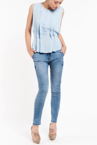 Нежная и изящная блузка шифоновой ткани небесно-голубого цвета! Модель без рукавов, с широкими декоративными складками впереди и тонким пояском, который завязывается сзади на талии.